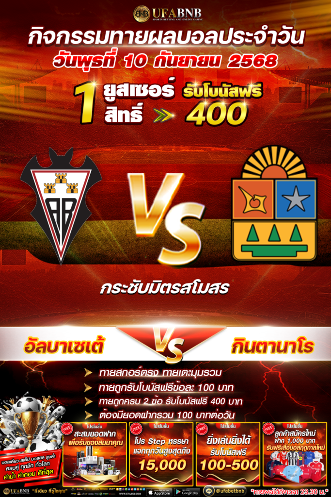 กิจกรรมทายผลฟุตบอล ระหว่าง อัลบาเซเต้ ⚽️ กินตานาโร ลุ้นรับโบนัสเครดิตฟรี 400 บาท (10/09/68)