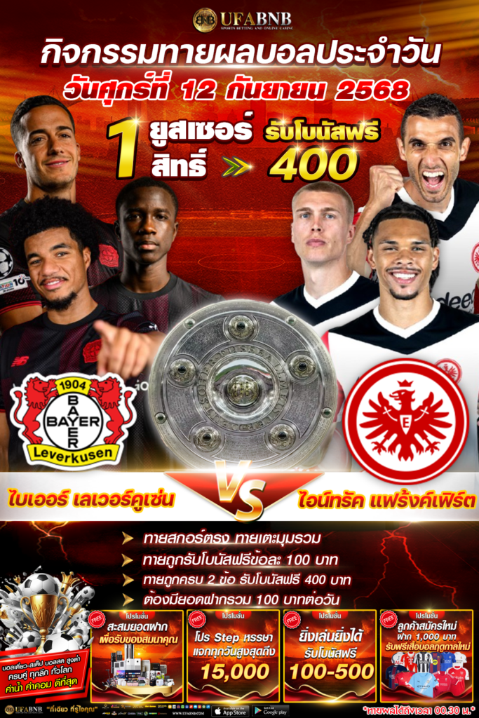 กิจกรรมทายผลฟุตบอล ระหว่าง ไบเออร์ เลเวอร์คูเซ่น ⚽️ ไอน์ทรัค แฟร้งค์เฟิร์ต ลุ้นรับโบนัสเครดิตฟรี 400 บาท (12/09/68)