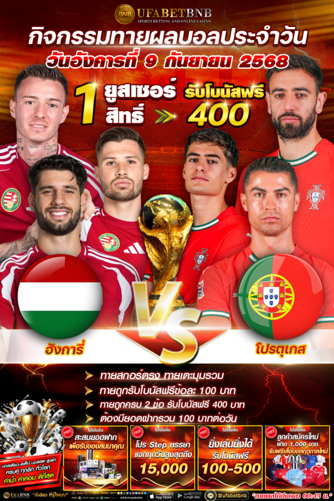 กิจกรรมทายผลฟุตบอล ระหว่าง ฮังการี่⚽️ โปรตุเกส ลุ้นรับโบนัสเครดิตฟรี 400 บาท (09/09/68)